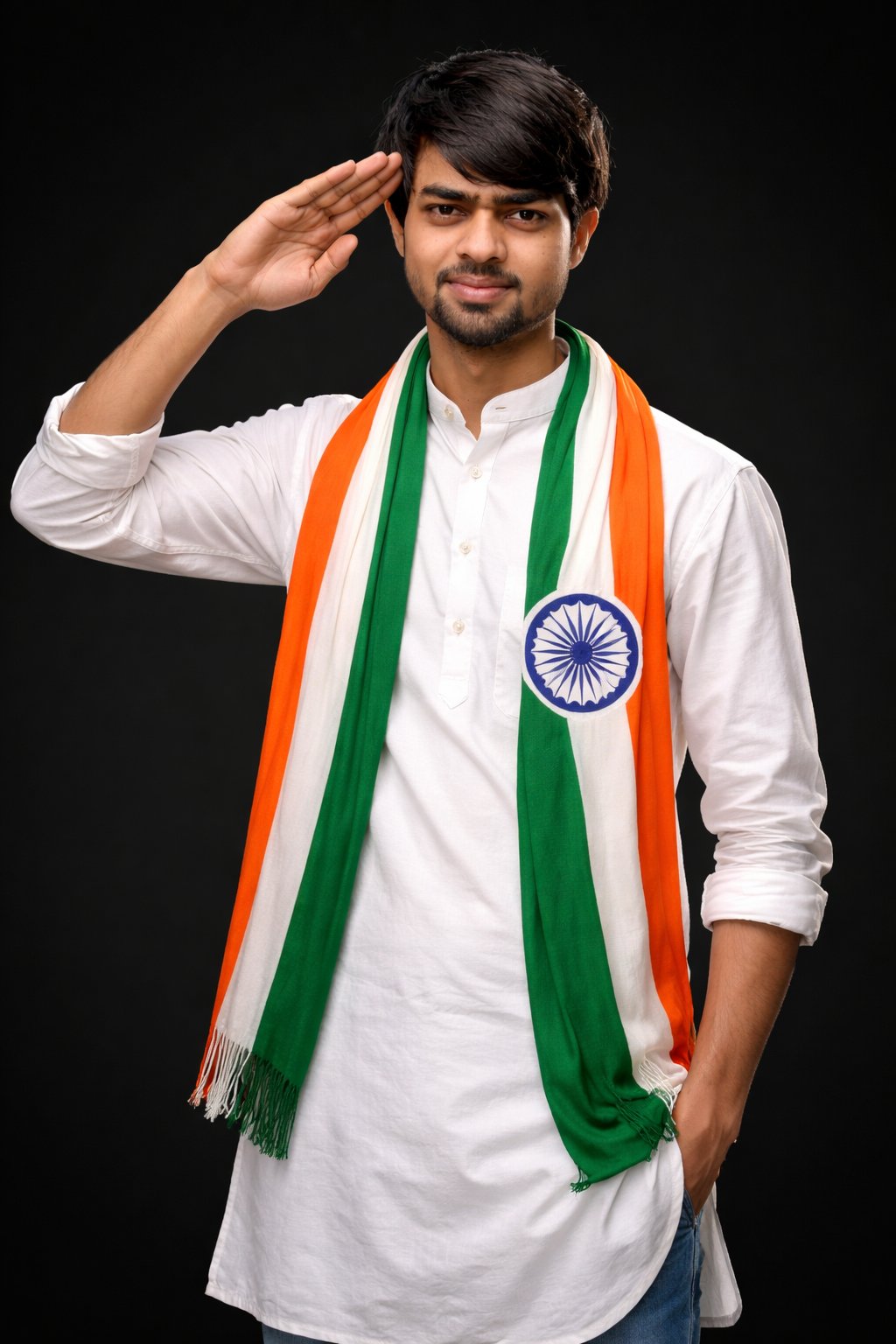 Use my reference image to create a vertical 9:16 ultra-realistic studio patriotic portrait on a pure deep-black seamless background; three-quarter/full-body centered composition; I am a young Indian man facing camera with a calm confident smile, giving a crisp salute with my right hand near the forehead, left arm relaxed; outfit exactly like reference: clean white kurta/shirt with subtle fabric folds and buttons, Indian tricolor (saffron-white-green) scarf/stole draped around neck and across chest with a clear navy-blue Ashoka Chakra emblem visible, natural modern hairstyle, light stubble; cinematic studio lighting (soft key light on face, gentle rim light on hair/shoulders, smooth shadows, high contrast), sharp focus on me with ultra-detailed skin texture, HDR, 4K, professional DSLR 85mm look, clean cutout edges, no extra props, no text, no watermark; preserve my exact face, identity, skin tone and body structure from the reference image, do not change the face, do not change body proportions—only enhance clarity, sharpness and overall cinematic grading.