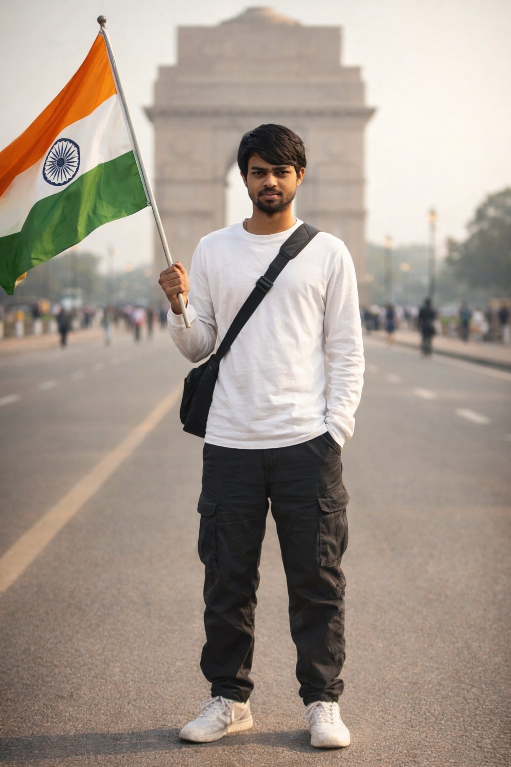 Use my reference image to create a vertical 9:16 ultra-realistic cinematic patriotic portrait on a wide road at India Gate, New Delhi; full-body centered composition, I am standing confidently facing camera with a calm expression, holding the Indian national flag on a pole in my right hand with the tricolor (saffron/white/green) and Ashoka Chakra sharp and detailed, flag gently flowing; I am wearing a plain white long-sleeve t-shirt, dark cargo pants, white sneakers, and a black crossbody sling bag across my chest; natural modern hairstyle, clean look; background shows India Gate monument large behind me with soft creamy bokeh, distant people and street elements very blurred, shallow depth of field; soft warm daylight, even light on face and body, realistic shadows, DSLR 85mm portrait look, high detail skin texture, professional photo quality, HDR, 4K, preserve my exact face and identity from the reference image, do not change the face, do not change body structure, only enhance clarity and overall cinematic grading.