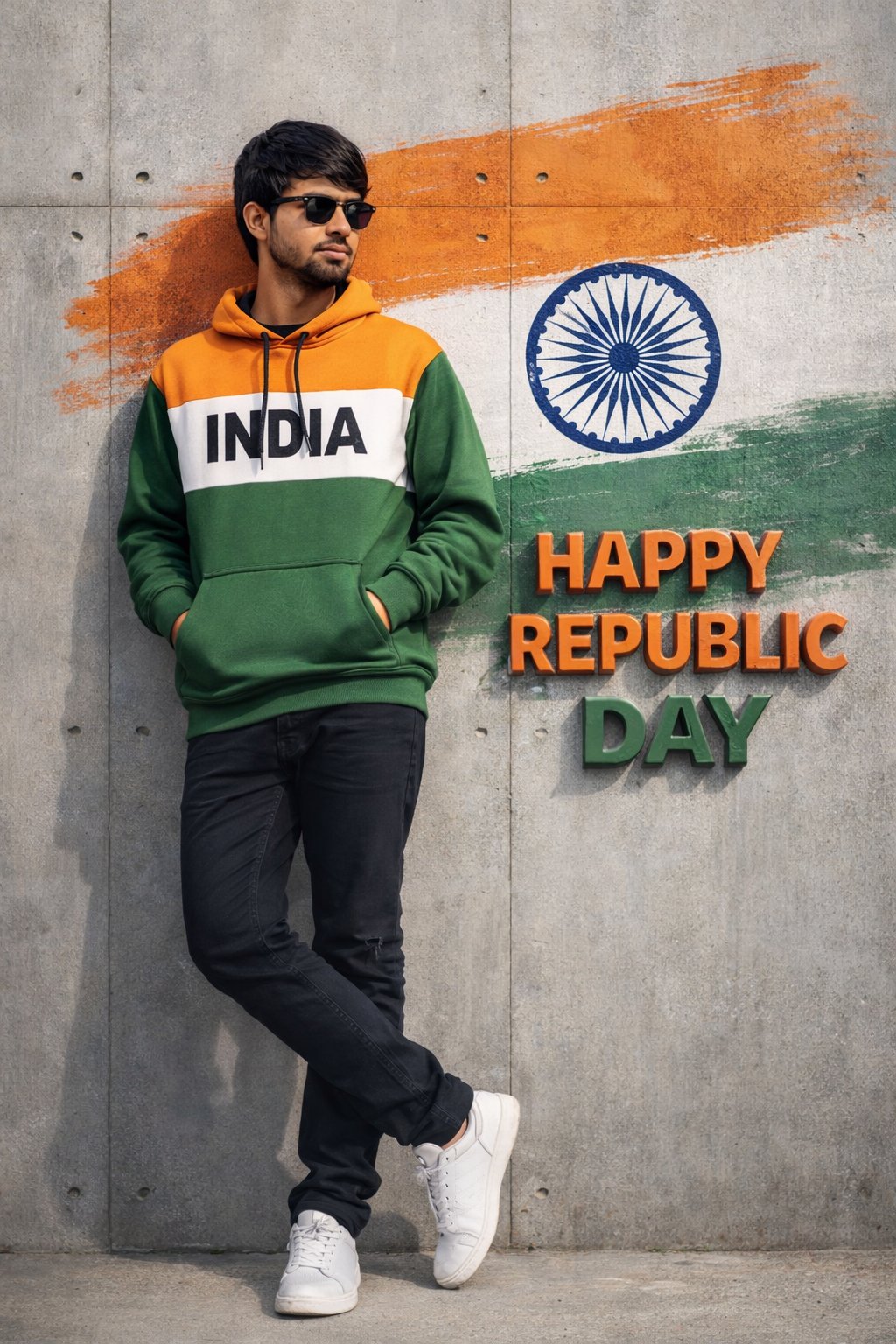 Use my reference image to create a vertical 9:16 ultra-realistic full-body patriotic poster photo; I am a young Indian man standing and casually leaning against a plain grey concrete wall with visible panel lines and bolt holes, hands in hoodie pockets, legs crossed at the ankles, relaxed confident pose, looking slightly to the side; preserve my exact face, identity, skin tone and body structure from the reference image—do not change the face, do not change body proportions; outfit exactly like this: black sunglasses, tricolor hoodie/sweatshirt with saffron on top, white middle with bold black “INDIA” text across the chest, green lower section and green sleeves, black slim-fit pants, clean white sneakers; background wall has a large rough brush-stroke Indian tricolor mural (saffron top, white middle, green bottom) painted behind me, with a clear navy-blue Ashoka Chakra centered on the white band; on the right side add bold 3D-style text “HAPPY REPUBLIC DAY” with “HAPPY REPUBLIC” in orange and “DAY” in green, slight shadow/emboss effect; natural daylight, soft realistic shadows, sharp focus on me, high detail, DSLR look, clean cinematic grading, no extra people, no watermark.